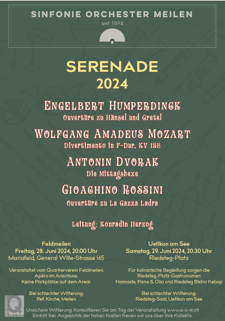 Geniessen Sie in lauschiger Atmosphäre ein Konzert mit dem Sinfonie Orchester Meilen. Ein musikalisches Highlight, welches nicht verpasst werden darf. Der Eintritt ist kostenlos. Das Sinfonie Orchester freut sich aber über eine Kollekte, der Quartierverein Feldmeilen über einen regen Besuch beim anschliessenden Apéro.