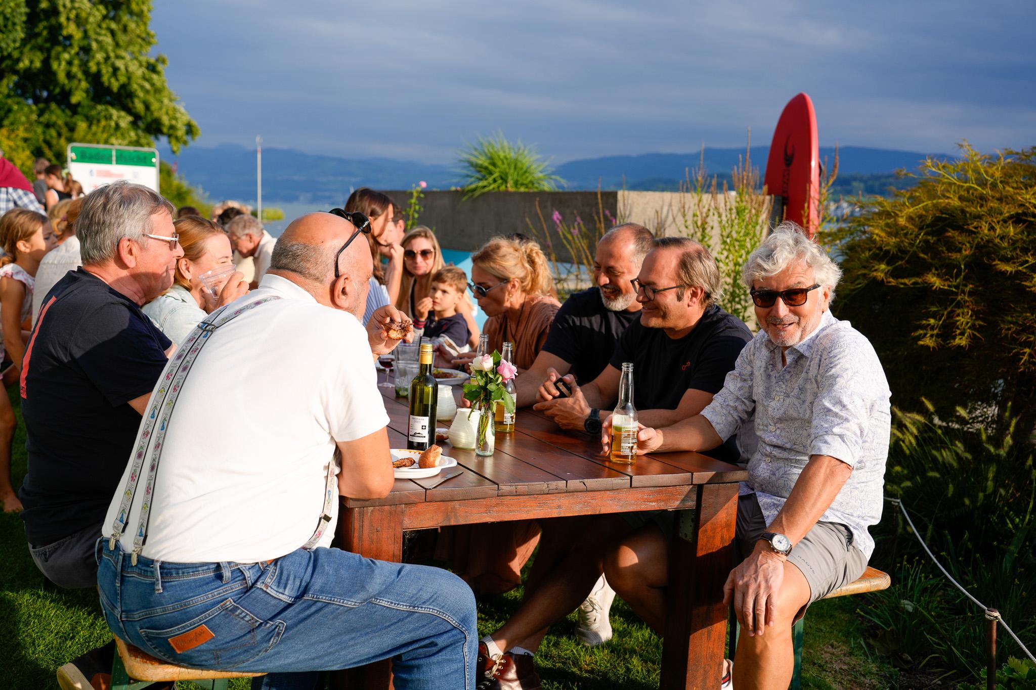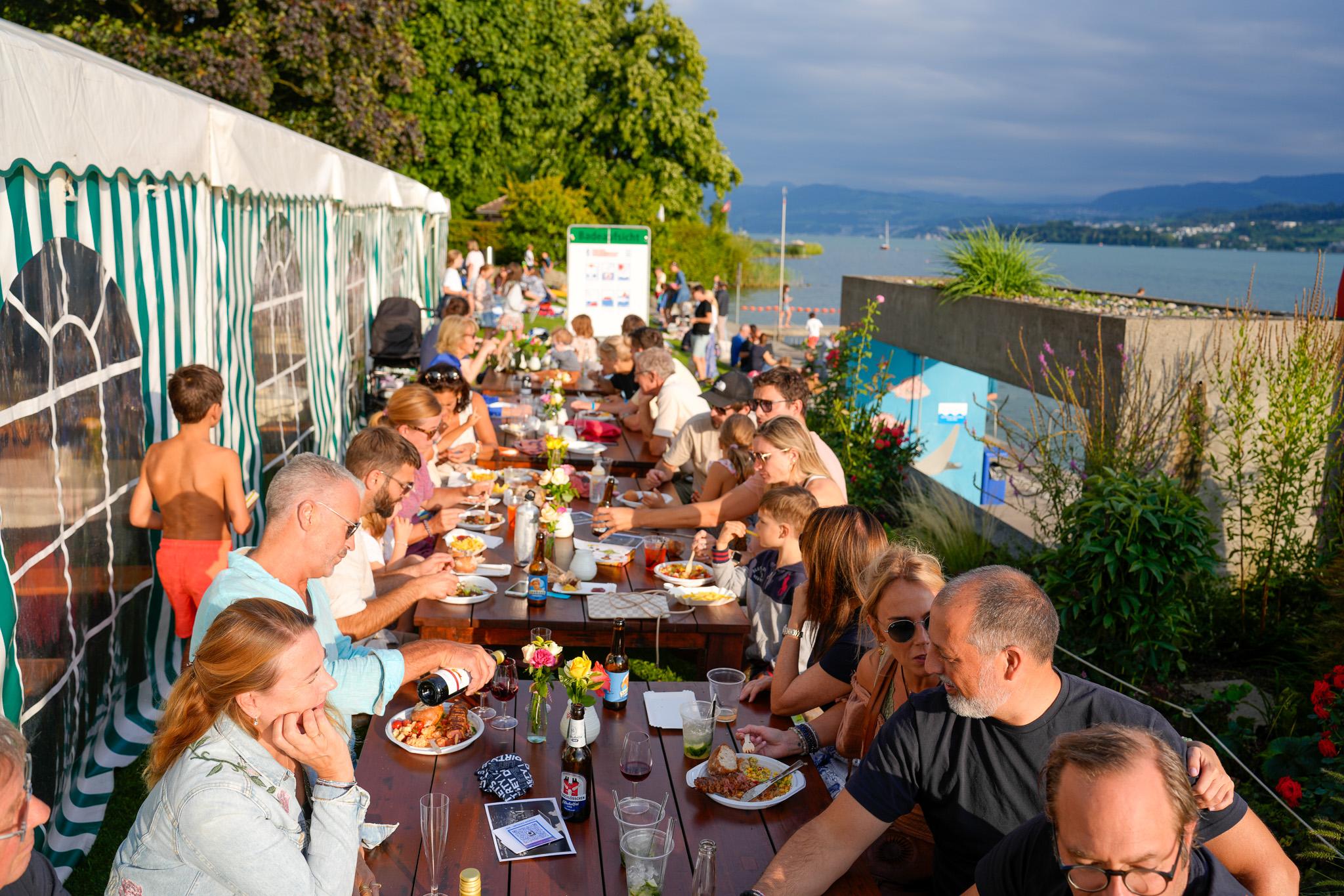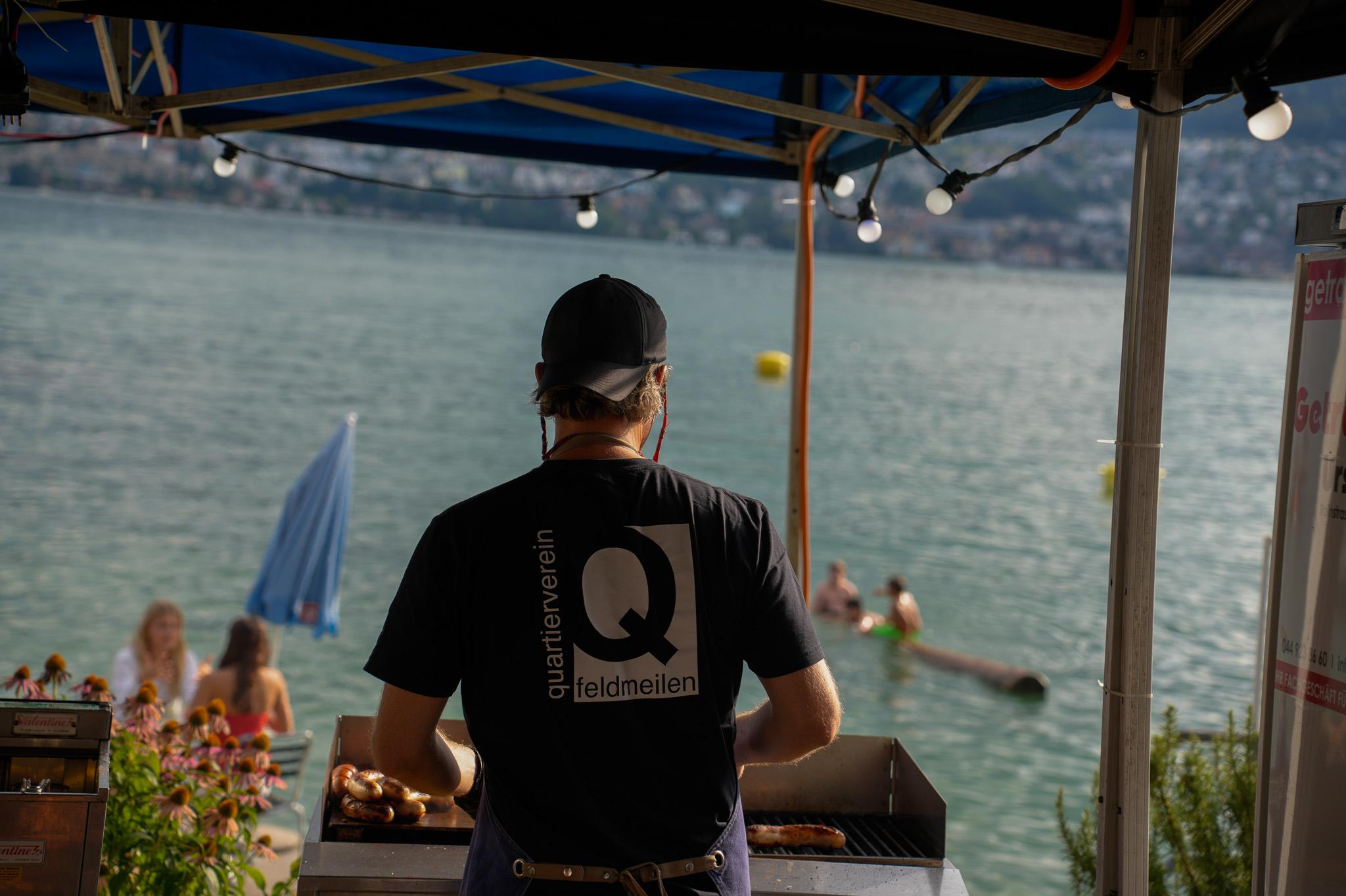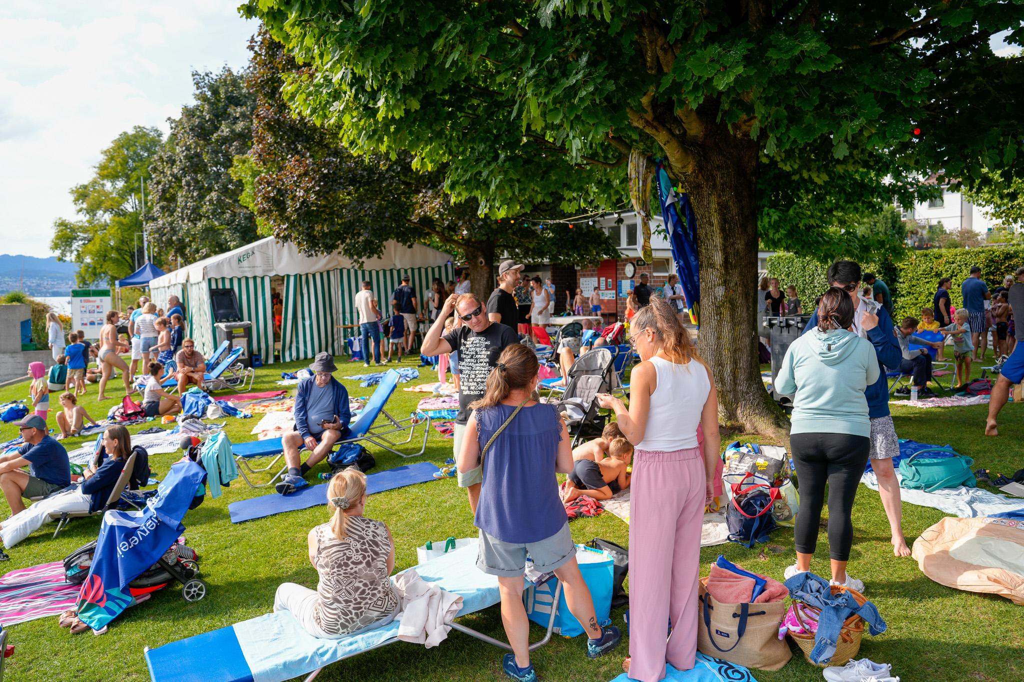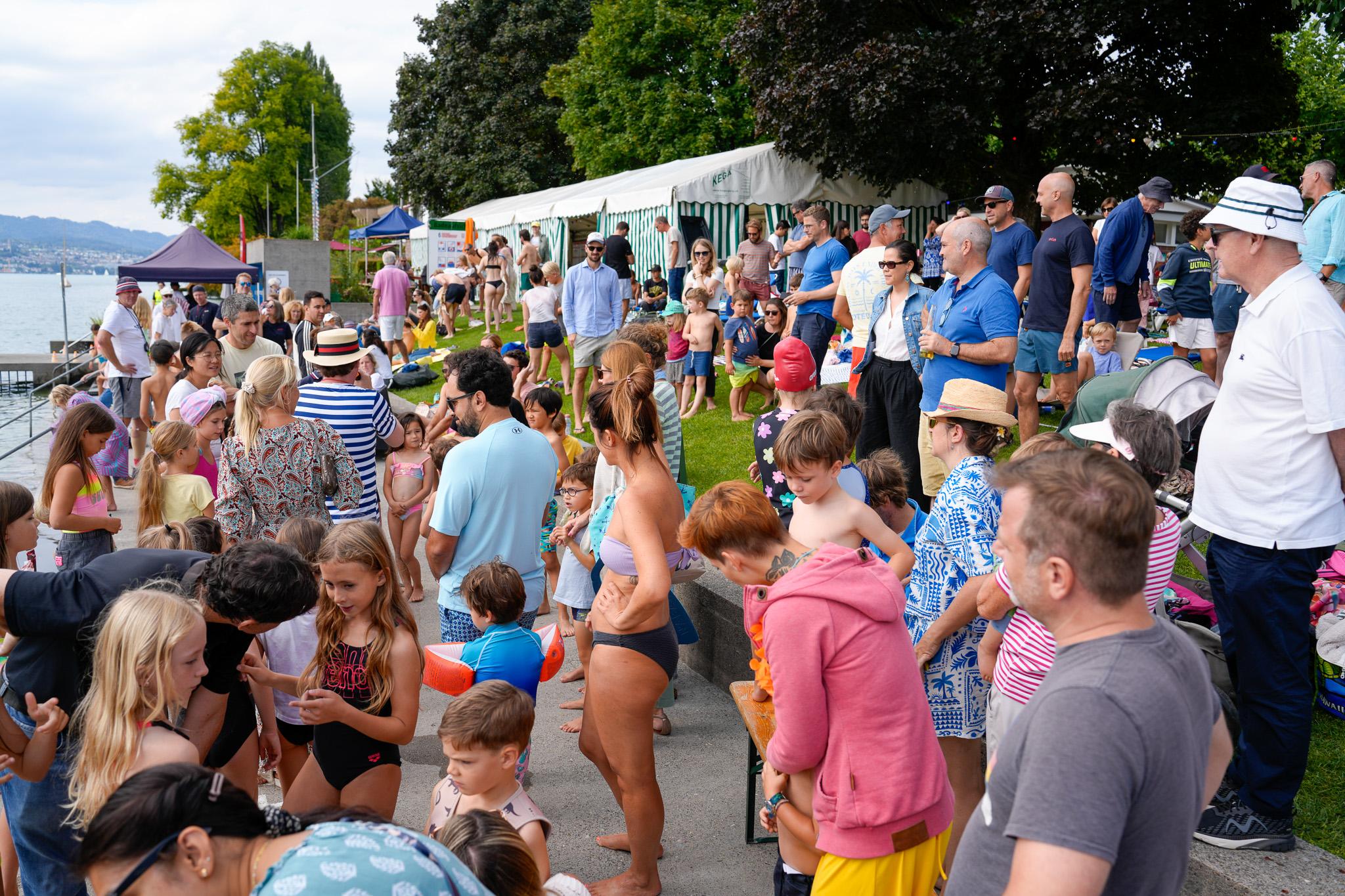 Das Schwimmfest entwickelte sich über die Jahre immer mehr zu einem Stelldichein für das ganze Quartier, für Kinder und Erwachsene, mit Festwirtschaft und Musik bis in die späten Abendstunden. Unzählige freiwillige Helfer sorgen mit selbstgebackenen Kuchen und Salaten für ein wunderbares Buffet, sie grillieren, schenken Getränke aus und kümmern sich nach dem Schwimmen um die Kinder. Der Schwimmclub Meilen sorgt für die exakte Zeitmessung. «Es ist wunderbar, wie engagiert und unkompliziert alle sind», findet Kathrin Jeker, Vorstandsmitglied des Quartiervereins. «Ohne die Mitwirkung so vieler Helfer wäre die Organisation gar nicht möglich, und wir schätzen uns glücklich, dass so viele jedes Jahr gerne mitmachen.»