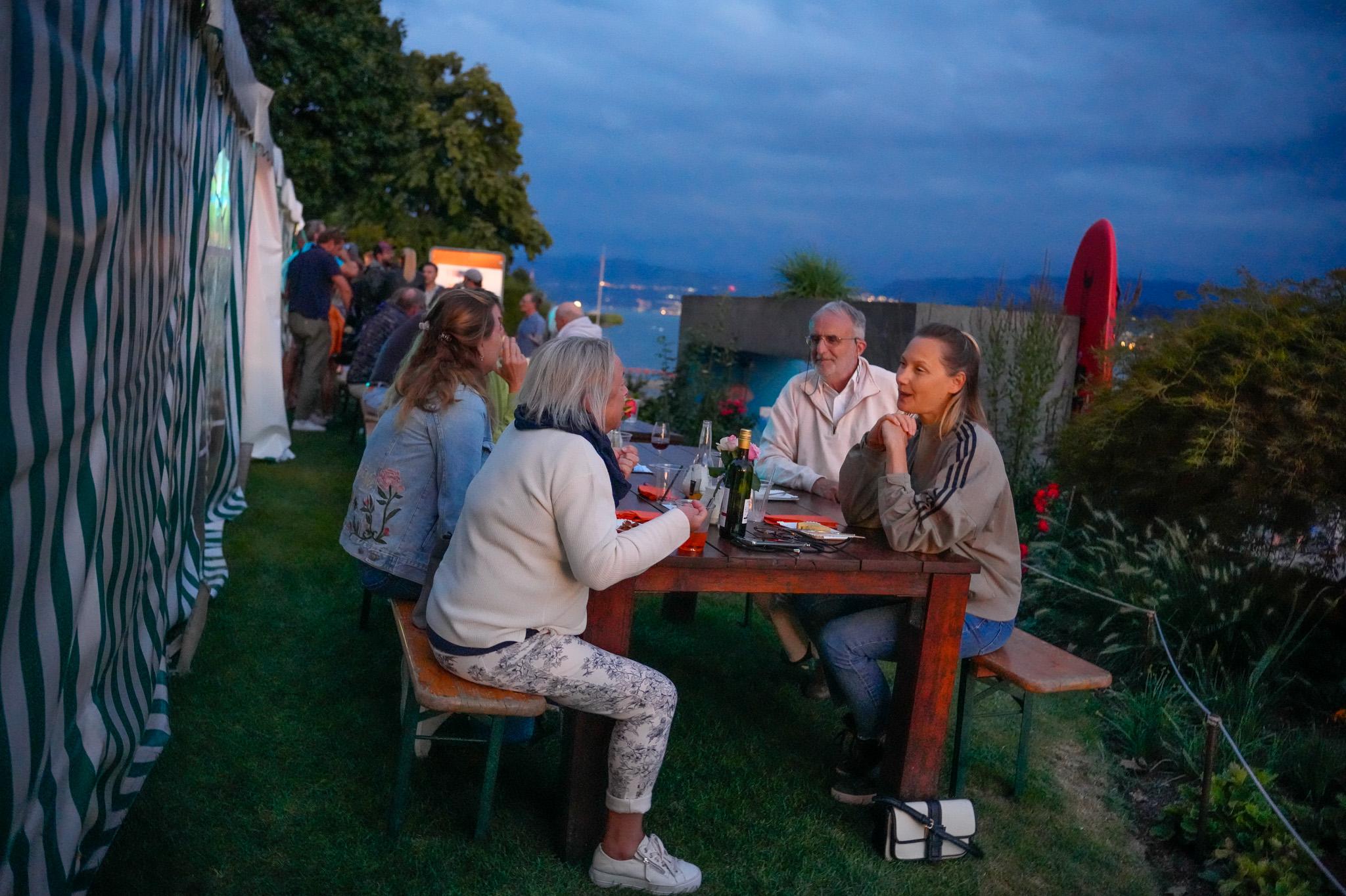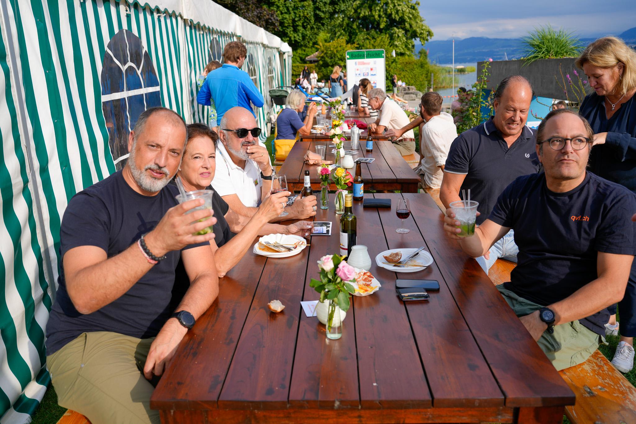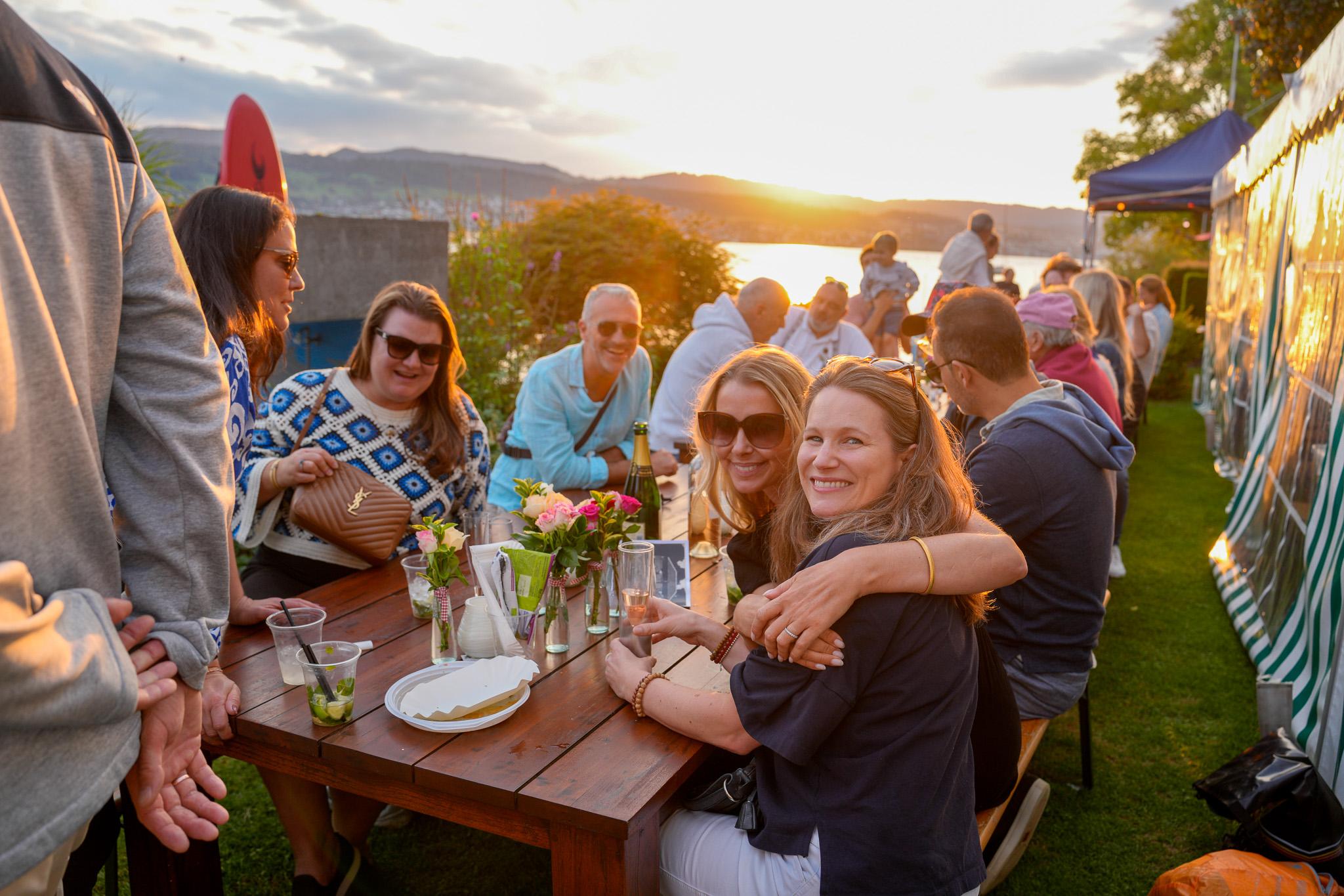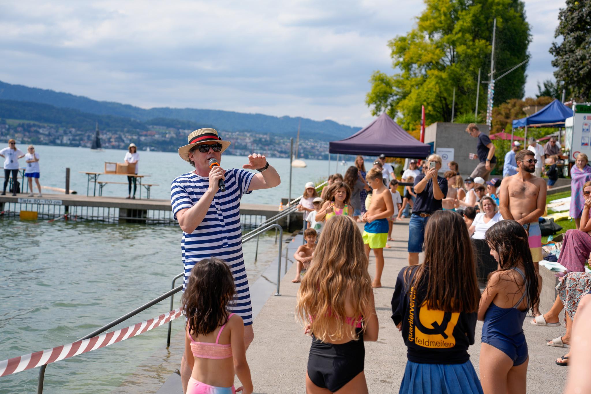 Das Schwimmfest entwickelte sich über die Jahre immer mehr zu einem Stelldichein für das ganze Quartier, für Kinder und Erwachsene, mit Festwirtschaft und Musik bis in die späten Abendstunden. Unzählige freiwillige Helfer sorgen mit selbstgebackenen Kuchen und Salaten für ein wunderbares Buffet, sie grillieren, schenken Getränke aus und kümmern sich nach dem Schwimmen um die Kinder. Der Schwimmclub Meilen sorgt für die exakte Zeitmessung. «Es ist wunderbar, wie engagiert und unkompliziert alle sind», findet Kathrin Jeker, Vorstandsmitglied des Quartiervereins. «Ohne die Mitwirkung so vieler Helfer wäre die Organisation gar nicht möglich, und wir schätzen uns glücklich, dass so viele jedes Jahr gerne mitmachen.»