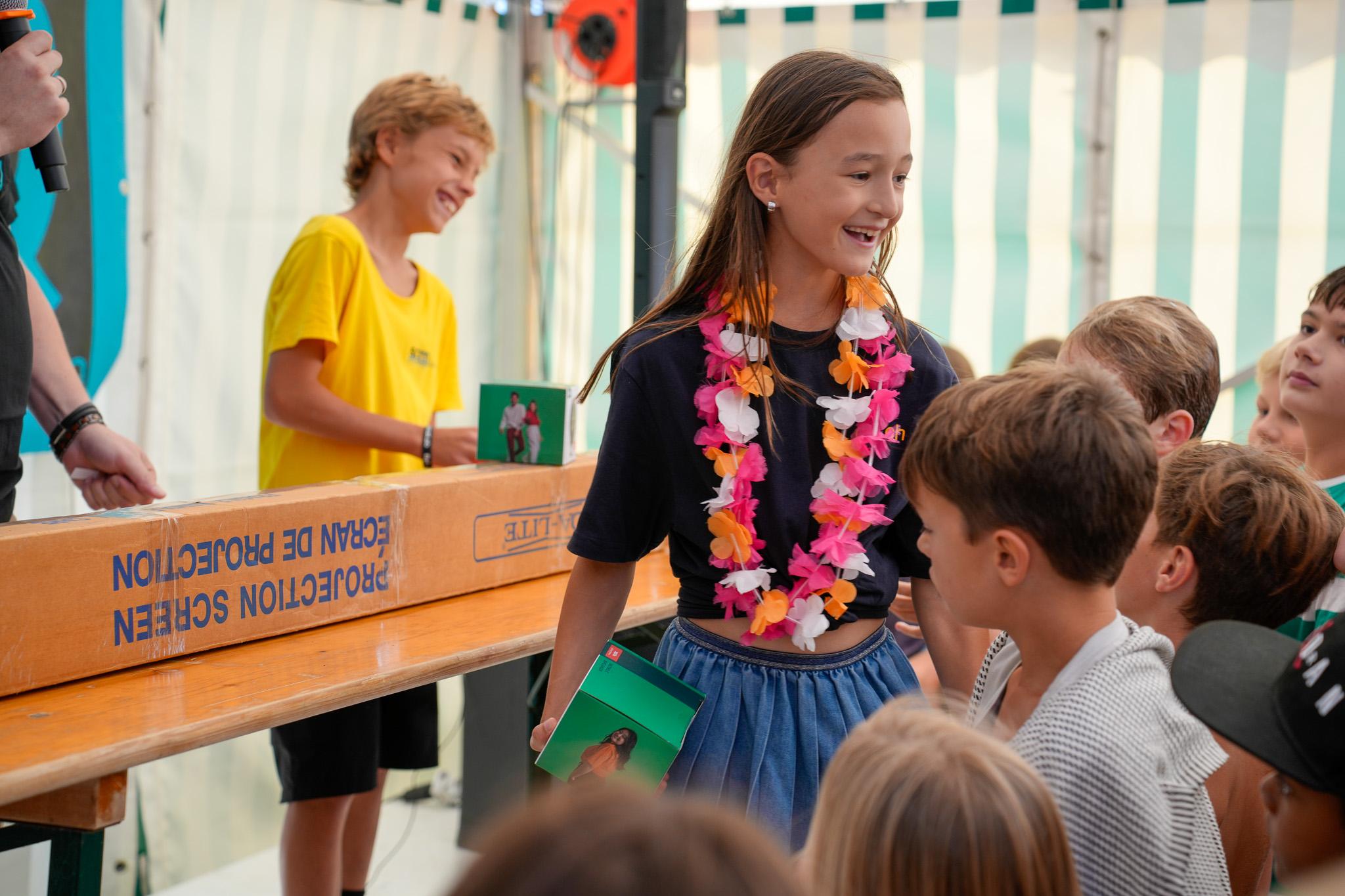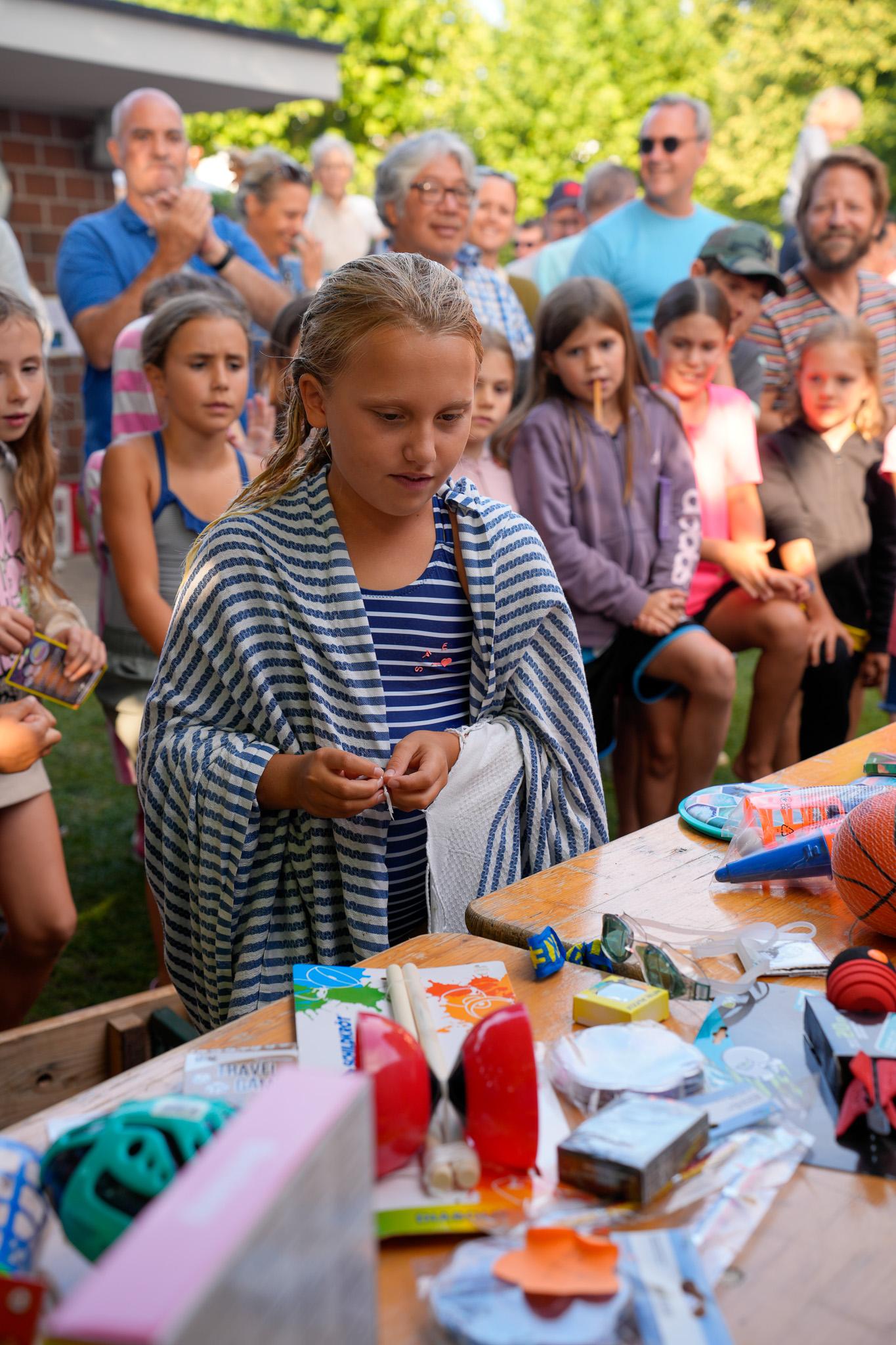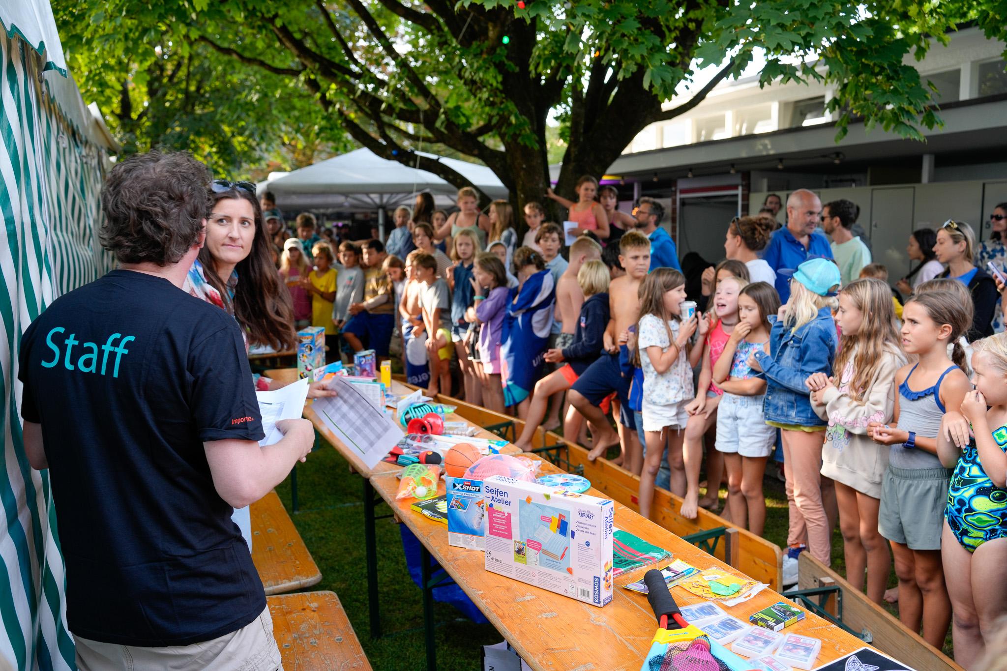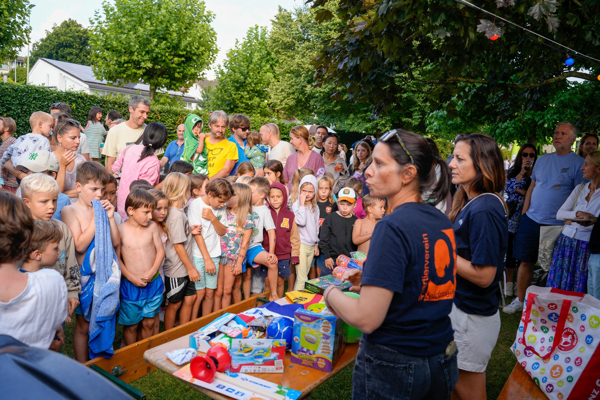 Auch dieses Jahr war der Aufmarsch der Besucher gross, trotz anfänglich recht kühlem Wetter. Doch pünktlich zu Beginn des Schwimmwettbewerbs zeigte sich die Sonne, und die Wolken verzogen sich immer mehr. «Hopp, hopp Gina! Super, Marco!», ertönte es vom Beckenrand. Insgesamt 112 Kinder nahmen am Wettbewerb teil, angefeuert von den Eltern und den Klassenkameraden. Auf die Schwimmer wartete neben den Preisen an der Rangverkündigung noch ein besonderes Geschenk: Zum 100-Jahre-Jubiläum bekam jedes mitschwimmende Kind ein schönes Badetuch mit Quartierverein-Logo. Dabeisein ist eben alles, nicht nur die Sieger werden beschenkt.