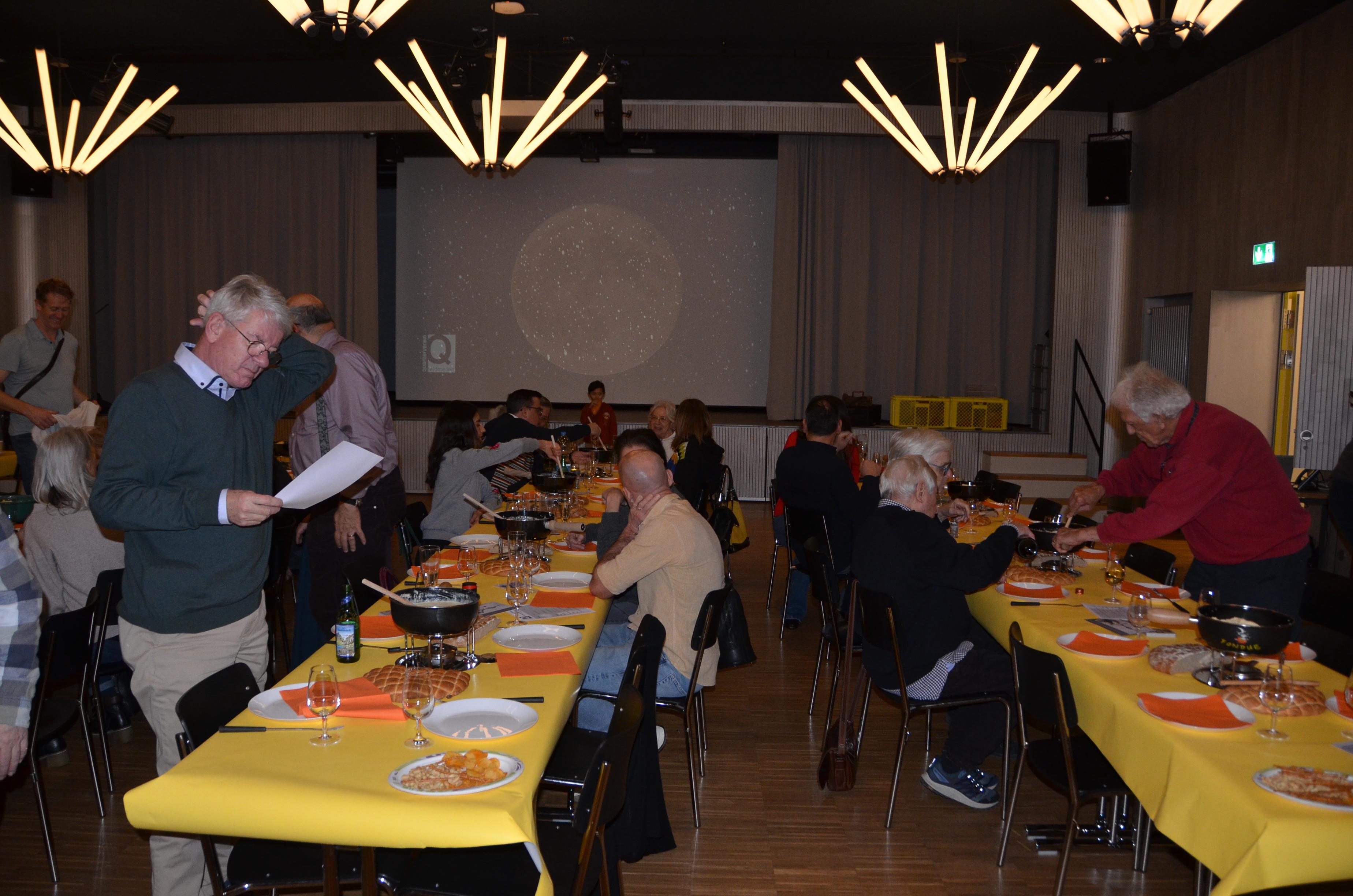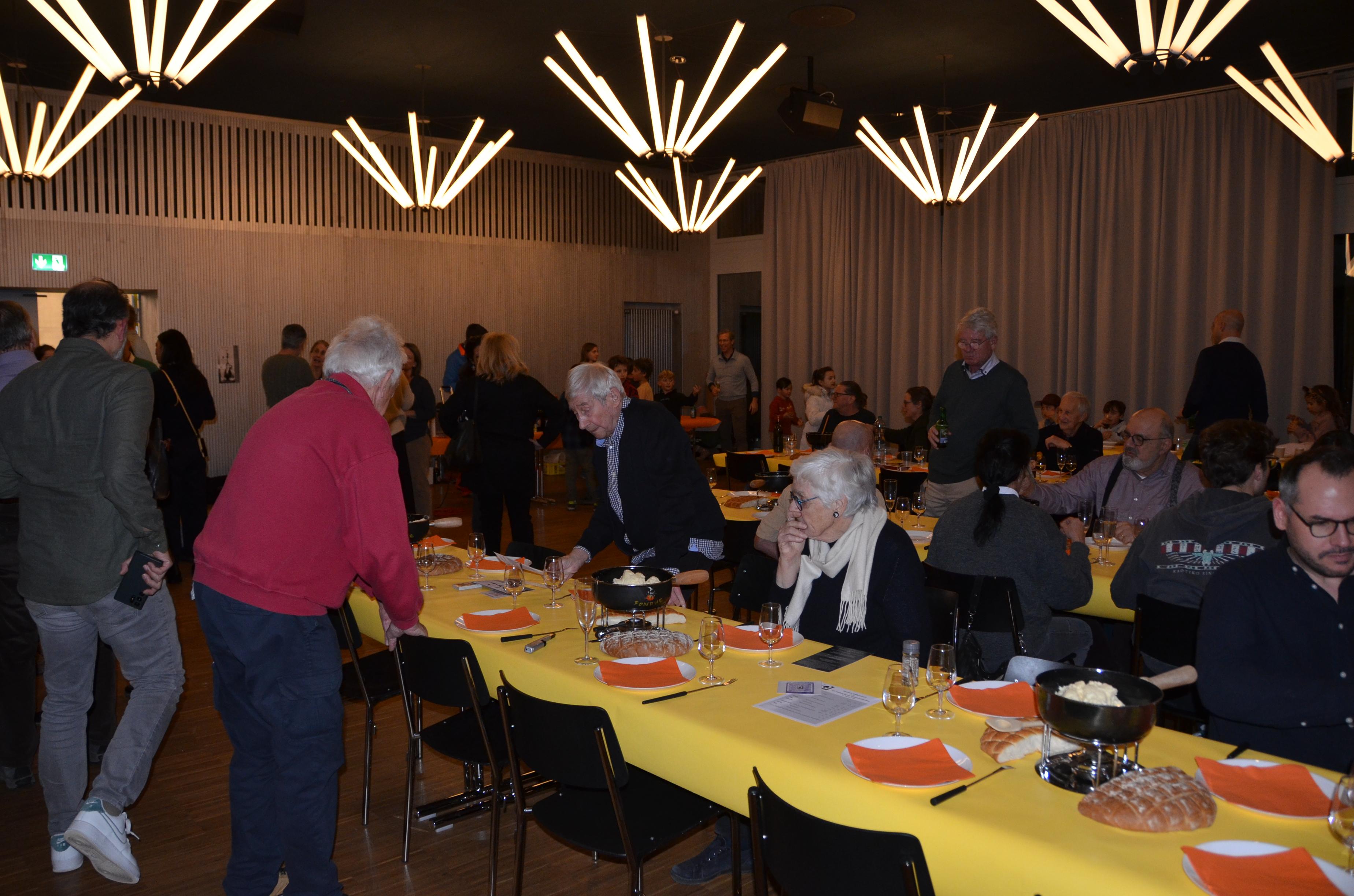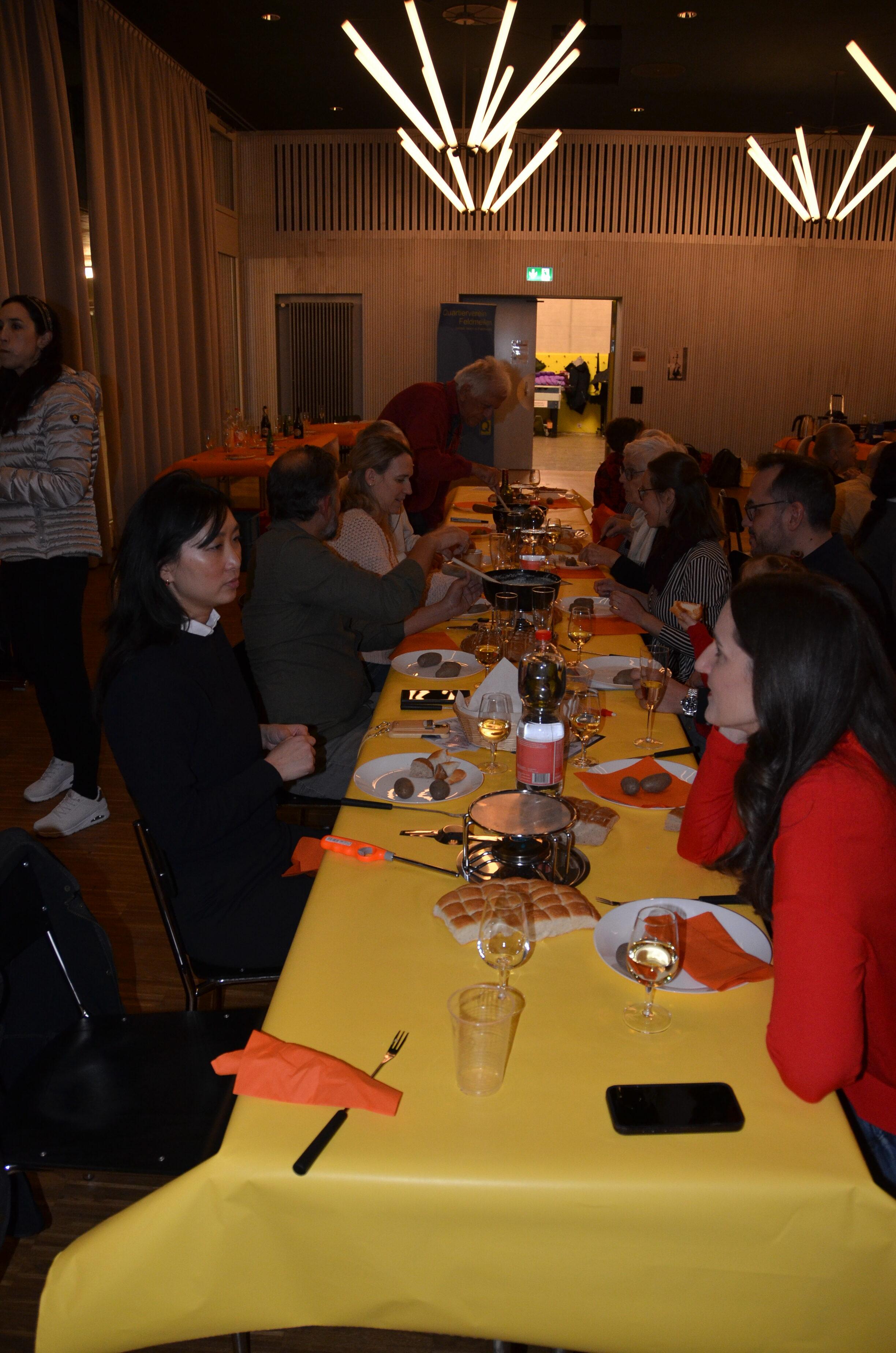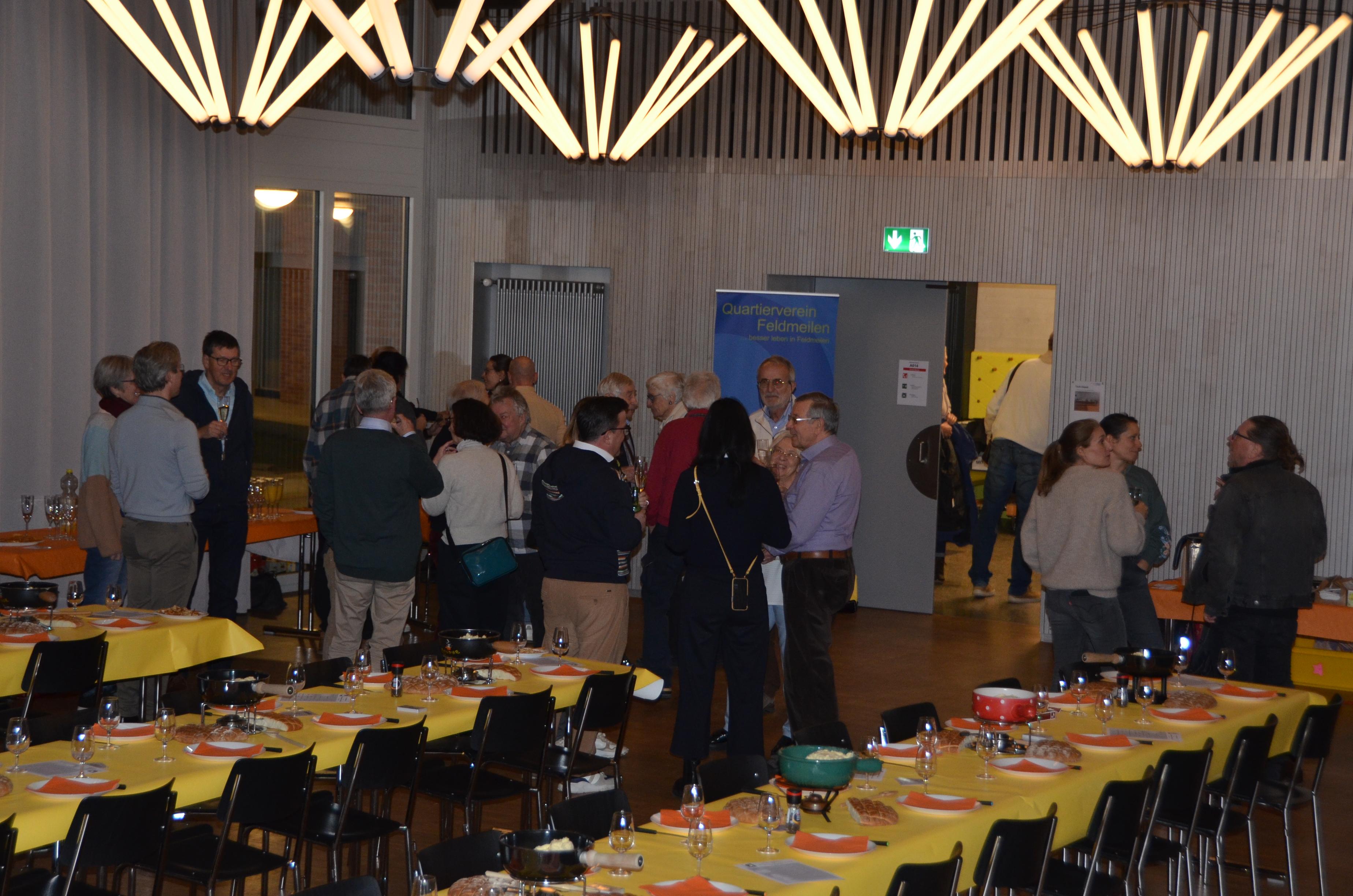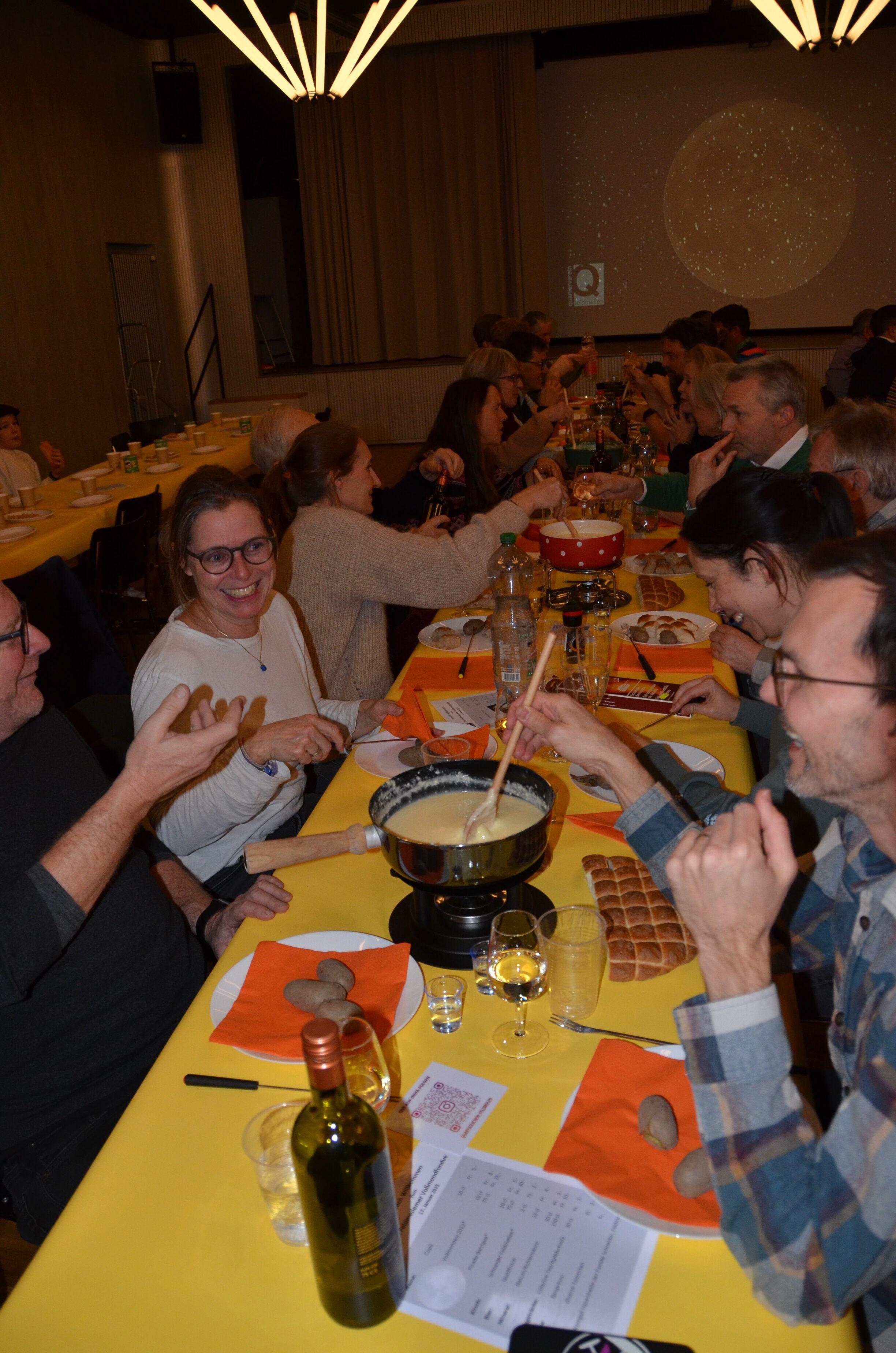 Die Aula des Schulhauses Feldmeilen wurde unter dem Schein des vollen Mondes, zu einem schönen Treffpunkt für alle aus dem Quartier, die Interesse haben, neue Leute kennenzulernen, die gerne zu Fuss in den Ausgang gehen oder die es ganz einfach schätzen, sich wieder einmal mit anderen auszutauschen. Dieses Jahr gab es jedoch aussergewöhnlich viele kurzfristige Abmeldungen, da viele krank waren. Und so fehlten dieses Jahr leider auch ein paar treue Vollmondfondue-Besucher und -Besucherinnen.