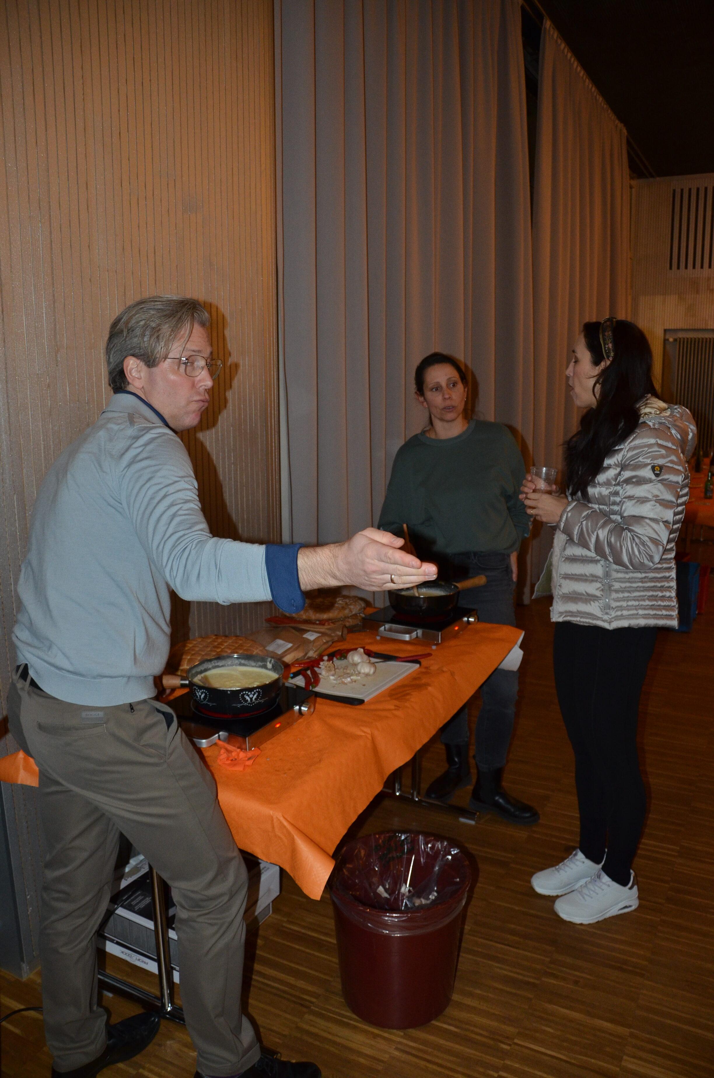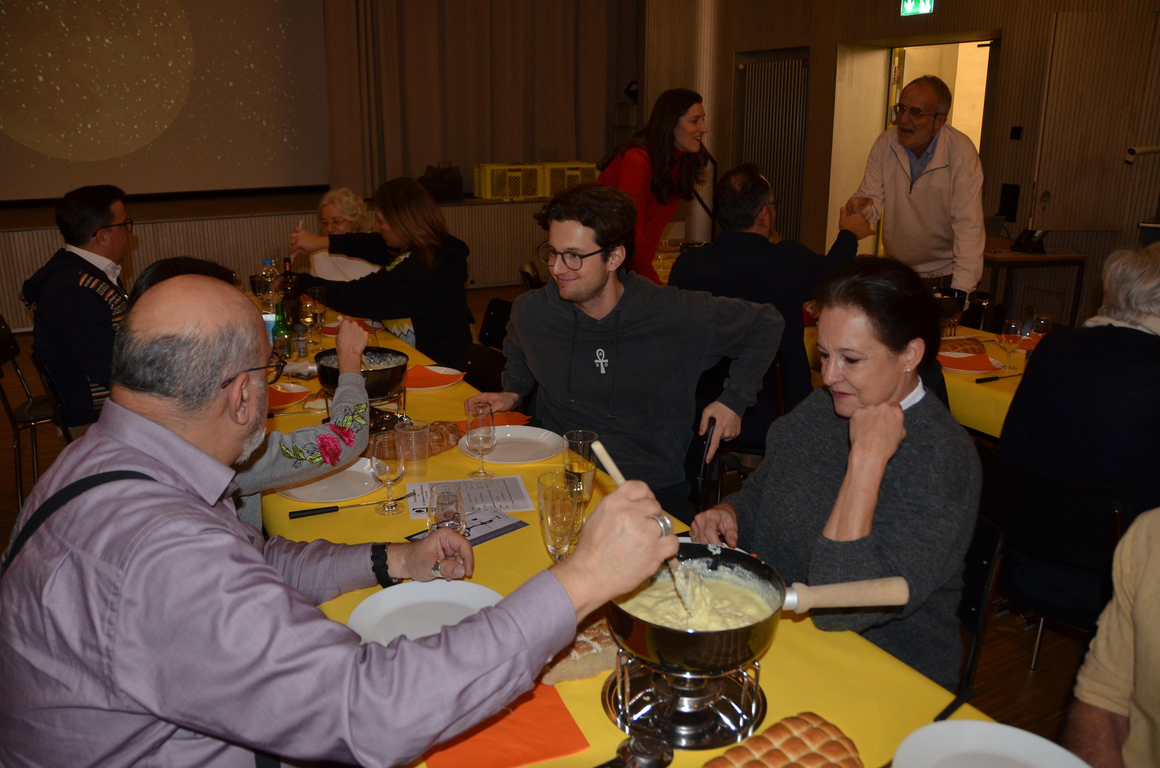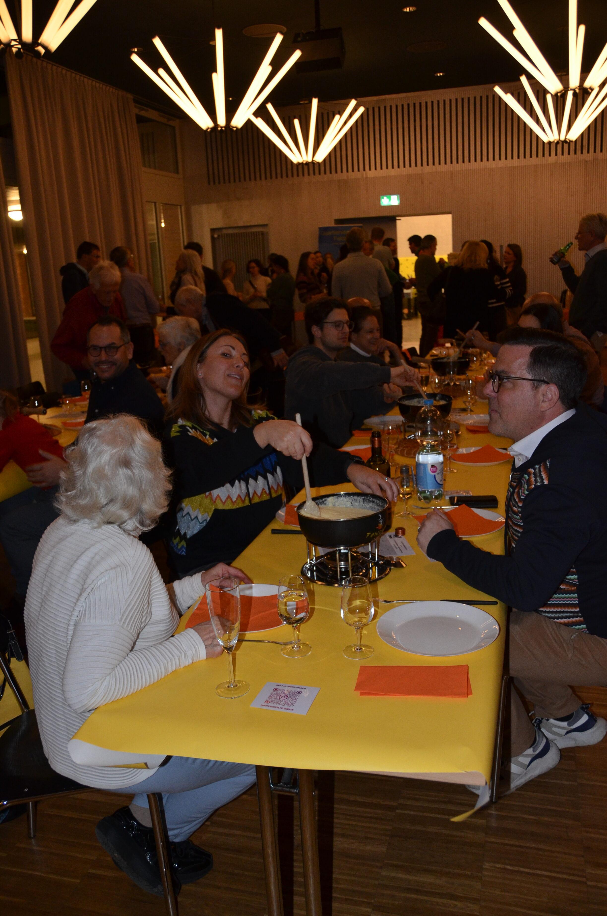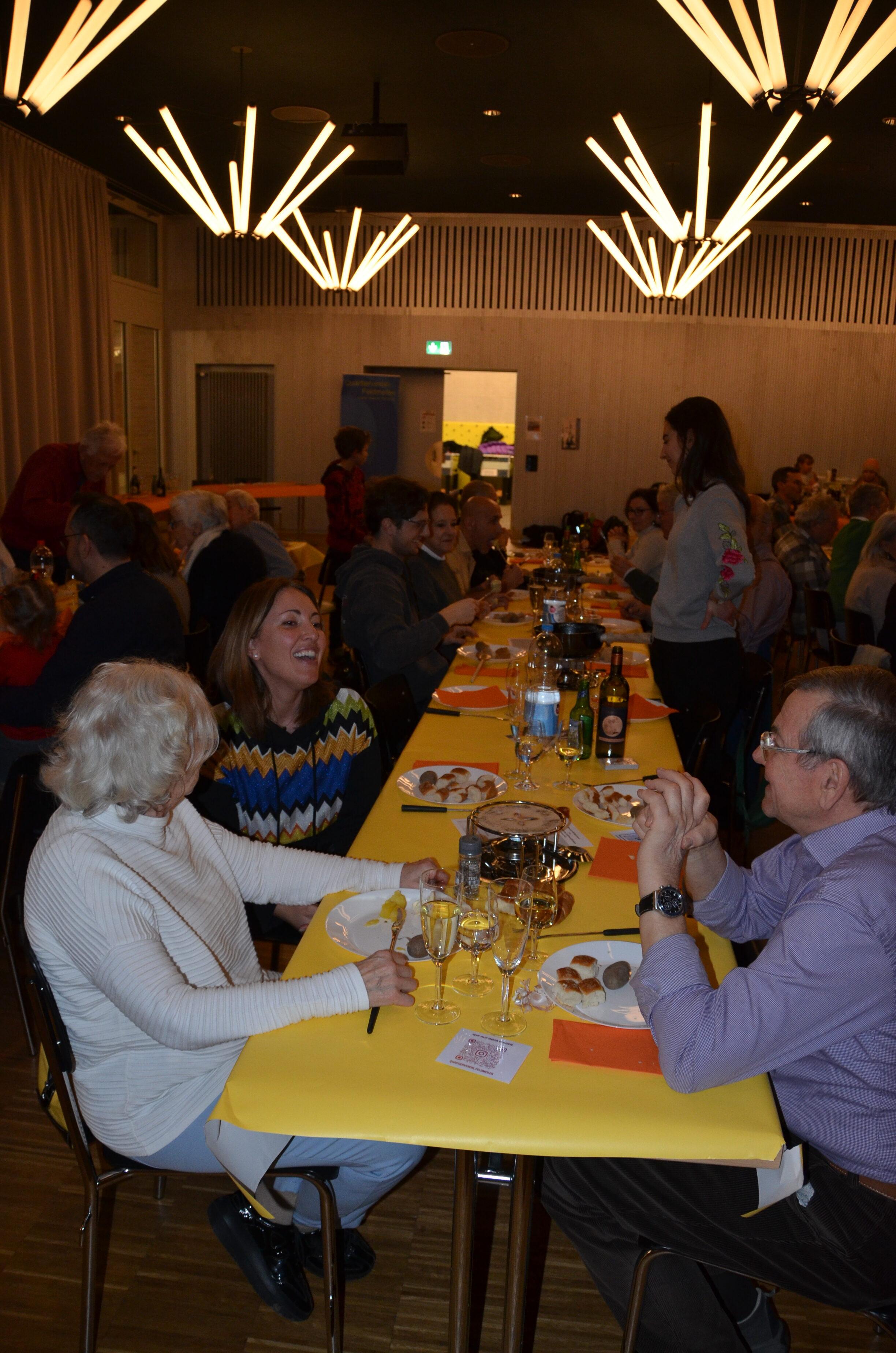 Die Aula des Schulhauses Feldmeilen wurde unter dem Schein des vollen Mondes, zu einem schönen Treffpunkt für alle aus dem Quartier, die Interesse haben, neue Leute kennenzulernen, die gerne zu Fuss in den Ausgang gehen oder die es ganz einfach schätzen, sich wieder einmal mit anderen auszutauschen. Dieses Jahr gab es jedoch aussergewöhnlich viele kurzfristige Abmeldungen, da viele krank waren. Und so fehlten dieses Jahr leider auch ein paar treue Vollmondfondue-Besucher und -Besucherinnen.